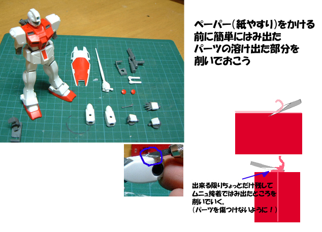 接着剤が乾いたらはみ出して固まった接着剤をある程度ナイフでそいでおきます。絶対に必要ではありませんがペーパーがけする時にこの方が効率がいいです。またパーパーをかける時間が短くすむのでエッジを削る等の失敗が減ります 接着剤ある程度乾いたら(2日ほど)ある程度大まかに接着剤を切り取るのも手です