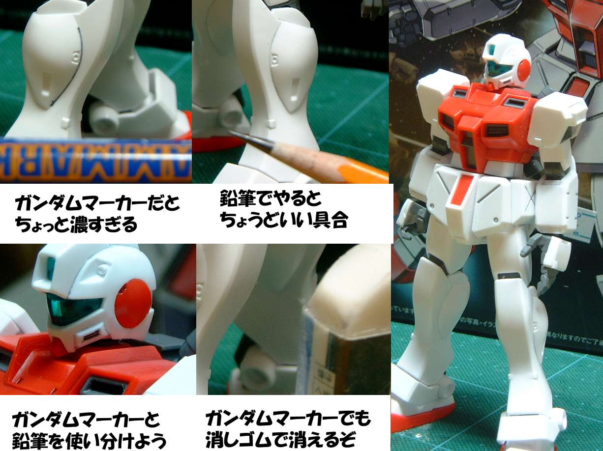 本来は部分塗装後に行う作業です。墨入れはガンダムマーカーを使って行います。白地に黒だとあまりにもきつい色に見えるのでグレーで行うのが定番です。今回は更に鉛筆を使い影になってる部分として表現の違いを狙っています。どちらも簡単にリカバー可能ですが逆に後でコーティングをする必要があります。またエナメルによる墨入れはプラを侵食するのでこういった簡単フィニッシュの場合は控えた方が無難です。