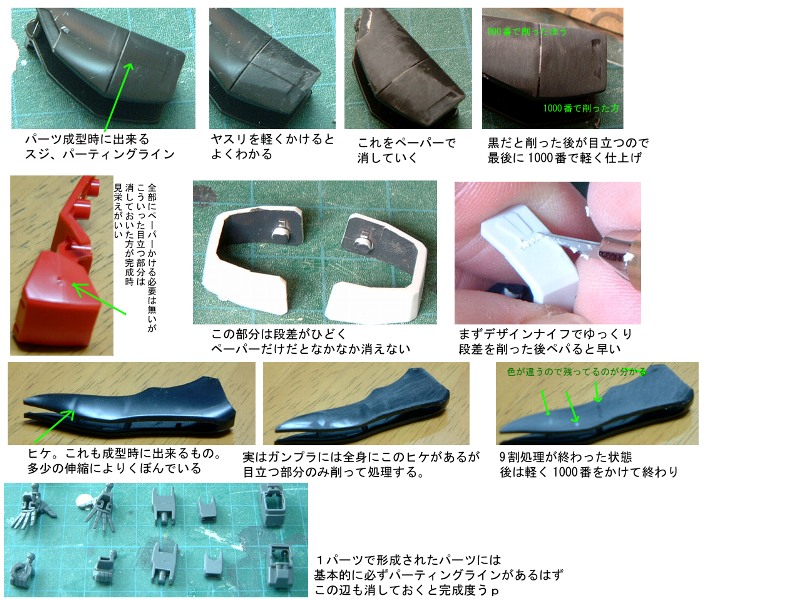 接着剤が乾くまで(1週間ほど)パーツの表面処理をします。余談ですが私は800番を使いますが黒いパーツは800→1000→1500と軽くでいいのでペパって処理していてほうがつや消しを吹いたときも綺麗に仕上がるようです。