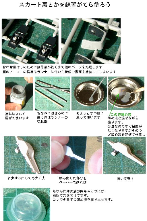 装甲の裏等も塗装しておきます。ラッカー系の塗料はそのままだと粘度がありすぎるので塗料皿等で薄めてから使用します。はみ出してもペーパーで削ればOK。簡単フィニッシュの利点です。